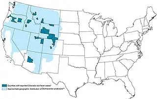 - ↑ Yendell, Stephanie J.; Fischer, Marc; Staples, J. Erin (May 2015). "Colorado tick fever in the United States, 2002-2012". Vector Borne and Zoonotic Diseases (Larchmont, N.Y.). 15 (5): 311–316. doi:10.1089/vbz.2014.1755. ISSN 1557-7759. PMC 6909933. PMID 25988440.