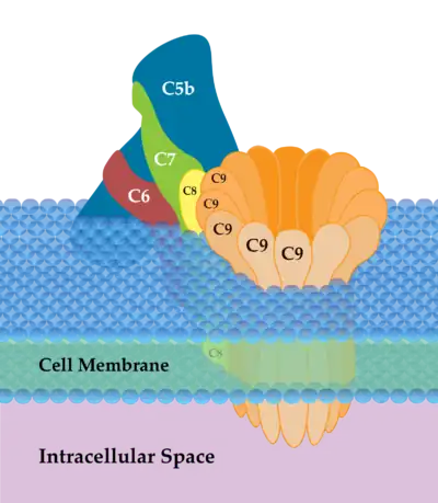 - ↑ Xie CB, Jane-Wit D, Pober JS (2020). "Complement Membrane Attack Complex: New Roles, Mechanisms of Action, and Therapeutic Targets". The American Journal of Pathology. 190 (6): 1138–1150. doi:10.1016/j.ajpath.2020.02.006. PMC 7280757. PMID 32194049.