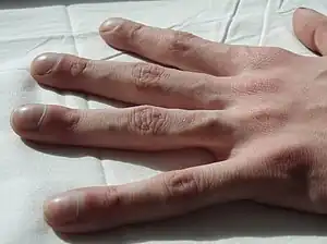 Clubbing in the fingers of a person with cystic fibrosis