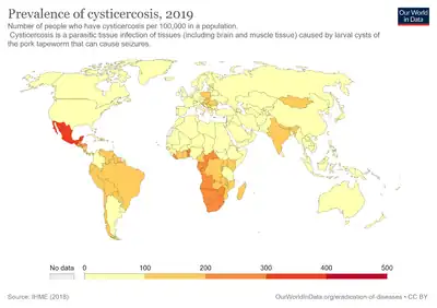 In Latin America, an estimated 75 million persons live in endemic areas and 400,000 people have symptomatic disease.[52] Some studies suggest that the prevalence of cysticercosis in Mexico is between 3.1 and 3.9 percent. Other studies have found the seroprevalence in areas of Guatemala, Bolivia, and Peru as high as 20 percent in humans, and 37 percent in pigs.[53] In Ethiopia, Kenya and the Democratic Republic of Congo around 10% of the population is infected, in Madagascar 16%. The distribution of cysticercosis coincides with the distribution of T. solium.[54] Cysticercosis is the most common cause of symptomatic epilepsy worldwide.[55]