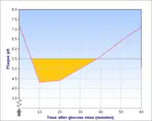 The frequency with which teeth are exposed to cariogenic (acidic) environments affects the likelihood of caries development. After meals or snacks, the bacteria in the mouth metabolize sugar, resulting in an acidic by-product that decreases pH. As time progresses, the pH returns to normal due to the buffering capacity of saliva and the dissolved mineral content of tooth surfaces. During every exposure to the acidic environment, portions of the inorganic mineral content at the surface of teeth dissolve and can remain dissolved for two hours.[33] Since teeth are vulnerable during these acidic periods, the development of dental caries relies heavily on the frequency of acid exposure.