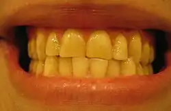 A profile of a smile, exhibiting a deviated dental midline about 2 mm to the left (the midline is measured as the mandible in relation to the maxilla. Even though the teeth are in an edge-to-edge position, the teeth are in maximum intercuspation; this patient possesses a Class III occlusion.