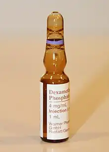 - ↑ "Dexamethasone 4.0 mg/ml injection – Summary of Product Characteristics (SPC)". electronic Medicines Compendium. Merck Sharp & Dohme Limited. 4 December 2013. Archived from the original on 8 May 2015. Retrieved 11 December 2013.