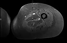 - ↑ Bhasin R, Ghobrial I (2013). "Diabetic myonecrosis: a diagnostic challenge in patients with long-standing diabetes". Journal of Community Hospital Internal Medicine Perspectives. 3 (1): 20494. doi:10.3402/jchimp.v3i1.20494. PMC 3716030. PMID 23882392.