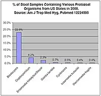 Figure 1 shows the prevalence of gastrointestinal protozoa in studies from the United States and Canada.[45][44] The most prevalent protozoa in these studies are considered emerging infectious diseases by some researchers, because a consensus does not yet exist in the medical and public health spheres concerning their importance in the role of human disease.[47][48] Researchers have suggested that their treatment may be complicated by differing opinions regarding pathogenicity, lack of reliable testing procedures, and lack of reliable treatments.[49] As with newly discovered pathogens before them, researchers are reporting that these organisms may be responsible for illnesses for which no clear cause has been found, such as irritable bowel syndrome.[50][51][52]