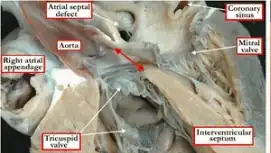 | Double outlet right ventricle sectioned in four-chamber fashion, showing the aorta arising exclusively from the right ventricle | |