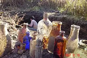 Dump digging is the practice of locating and excavating old garbage dumps with the intent of discovering objects which have potential value as collectibles or antiques.[1] These dumps are sometimes centuries old, but often date to the late 19th century or early part of the 20th century. Among other things, the practice of dump digging is directly linked to antique bottle collecting and glassmaking.[2]
