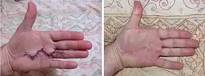 Typically, the excised skin is replaced with a skin graft, usually full-thickness,[31] consisting of the epidermis and the entire dermis. In most cases the graft is taken from the antecubital fossa (the crease of skin at the elbow joint) or the inner side of the upper arm.[41][42] This place is chosen because the skin color best matches the palm's skin color. The skin on the inner side of the upper arm is thin and has enough skin to supply a full-thickness graft. The donor site can be closed with a direct suture.[41]
