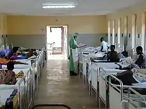 Health-care workers treating people with Ebola are at greatest risk of infection.[55] The risk increases when they do not have appropriate protective clothing such as masks, gowns, gloves and eye protection; do not wear it properly; or handle contaminated clothing incorrectly.[55] This risk is particularly common in parts of Africa where the disease mostly occurs and health systems function poorly.[66] There has been transmission in hospitals in some African countries that reuse hypodermic needles.[67][68] Some health-care centres caring for people with the disease do not have running water.[69] In the United States the spread to two medical workers treating infected patients prompted criticism of inadequate training and procedures.[70]