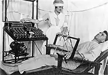 ECT soon replaced metrazol therapy all over the world because it was cheaper, less frightening and more convenient.[20] Cerletti and Bini were nominated for a Nobel Prize but did not receive one. By 1940, the procedure was introduced to both England and the US. In Germany and Austria, it was promoted by Friedrich Meggendorfer. Through the 1940s and 1950s, the use of ECT became widespread. At the time the ECT device was patented and commercialized abroad, the two Italian inventors had competitive tensions that damaged their relationship.[21] In the 1960s, despite a climate of condemnation, the original Cerletti-Bini ECT apparatus prototype was contended by scientific museums between Italy and the US.[22] The ECT apparatus prototype is now owned and displayed by the Sapienza Museum of the History of Medicine in Rome.[22]