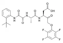 The substance acts as a pan-caspase inhibitor and has antiapoptotic and antiinflammatory effects.[4] It was developed for the treatment of liver disease[5] and has been granted fast track designation by the FDA for the treatment of non-alcoholic steatohepatitis cirrhosis[6][7][8] The substance is the first pan-caspase inhibitor to advance to broad clinical testing, and its novel mechanism of action has led to research using it for other potential applications.[9][10]