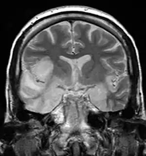 | MRI scan image shows high signal in the temporal lobes and right inferior frontal gyrus in someone with HSV encephalitis. | |