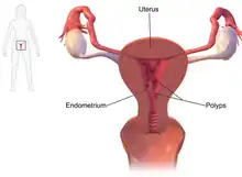 An endometrial polyp, also known as a uterine polyp is a growth attached to the inside of the uterus.[1] There may be no symptoms, or it may result in abnormal vaginal bleeding and difficulty becoming pregnant.[1] They can vary in size from very small to large enough to fill the entire uterine cavity.[2] There may be one or several, and they typically have a stalk which may have a narrow or wide base.[1] If the stalk is long enough, it may protrude into the vagina.[3]