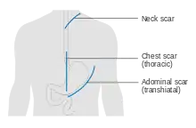 The traditional transthoracic approach enters the body through the chest, and has a number of variations. The thoracoabdominal approach opens the abdominal and thoracic cavities together, the two-stage Ivor Lewis (also called Lewis–Tanner) approach involves an initial laparotomy and construction of a gastric tube, followed by a right thoracotomy to excise the tumor and create an esophagogastric anastomosis. The three-stage McKeown approach adds a third incision in the neck to complete the cervical anastomosis. Recent approaches by some surgeons use what is called extended esophagectomy, where more surrounding tissue, including lymph nodes, is removed en bloc.[57]