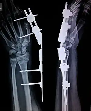 X-ray image of an external fixator being used to stabilise a Colles' fracture involving the Radius bone