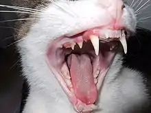 A fang is a long, pointed tooth.[1] In mammals, a fang is a modified maxillary tooth, used for biting and tearing flesh. In snakes, it is a specialized tooth that is associated with a venom gland (see snake venom).[2] Spiders also have external fangs, which are part of the chelicerae.