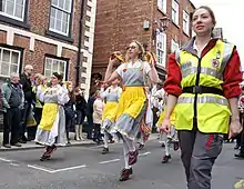First aider of the British Red Cross accompanies parade of morris dancers at the Knutsford Royal May Day, Knutsford, Cheshire, England, 2012