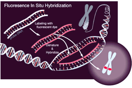 Fluorescent in-situ hybridization is a process which displays chromosomes with fluorescent molecules, this is useful for identifying chromosomal abnormalities and for gene mapping.