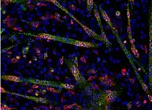 Single-molecule RNA FISH, also known as Stellaris® RNA FISH[13] or smFISH,[28] is a method of detecting and quantifying mRNA and other long RNA molecules in a thin layer of tissue sample. Targets can be reliably imaged through the application of multiple short singly labeled oligonucleotide probes.[29] The binding of up to 48 fluorescent labeled oligos to a single molecule of mRNA provides sufficient fluorescence to accurately detect and localize each target mRNA in a wide-field fluorescent microscopy image. Probes not binding to the intended sequence do not achieve sufficient localized fluorescence to be distinguished from background.[30]