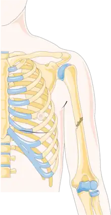 A humerus fracture is a break of the humerus bone in the upper arm.[1] Symptoms may include pain, swelling, and bruising.[1] There may be a decreased ability to move the arm and the person may present holding their elbow.[2] Complications may include injury to an artery or nerve, and compartment syndrome.[2]
