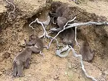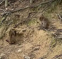 Geophagy is a behavioural adaptation seen in 136 species of nonhuman primates from the suborder Haplorrhini (81%) and Strepsirrhini (19%).[19] The most commonly ingested soils are soils from mounds, soils from tree bases, soils from termite mounds, 'Pong' soils, forest floor.[4] Studies have shown many benefits of geophagy such as protection from parasites (4.9%), minerals supplements (19.5%) and helps metabolize toxic compounds from leaves (12.2%) nonexclusive.[4] From soil analysis it has been seen that one of the main compounds in the earth consumed by these primates is clay minerals that contains kaolinite which is commonly used in medications for diarrheal and intestinal problems.[20] Geophagic behaviour plays an important role in nonhuman primates health.[4] This kind of zoopharmacognosy use differs from one species to another. For example, Mountain Gorillas from Rwanda tend to ingest clay soil during dry season, when the vegetation changes forcing them to feed on plants that have more toxic compounds, in this case the ingested clay absorbs these toxins providing digestive benefits.[4] This kind of seasonal behavioural adaptation is also seen in the Red-Handed Howler monkeys from the western Brazilian Amazonia, which also have to adapt to the shift of feeding on leaves that contains more toxic compounds.[21] In other cases, geophagy is used by the Ring-Tailed Lemurs as a preventive and therapeutic behaviour for parasites control and intestinal infection.[19] These benefits from clay ingestion can also be observed among Rhesus Macaques.[20] In a study that was carried out in the Island of Cayo Santiago, it has been observed that the Rhesus Macaques had intestinal parasites and their health was not affected and they did not have many gastrointestinal effects from these parasites.[20] Data observed, shows that this was caused by the consumption of clay soil by this species.[20] On the other hand observations have shown that behavioural geophagy provides minerals supplements, as seen among Cambodian's Colobinae.[22] The study was done at the salt licks in Veun Sai-Siem Pang Conservation Area, a site that is visited by various species of nonhuman primates.[22] More in-depth research needs to be carried out in order to better understand this behavioural adaptation of geaophagy among nonhuman primates.