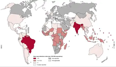 {{cite encyclopedia}}:|work=ignored (help) - ↑ "Western Pacific Regional Leprosy Situation in 2005 Fact sheet 28, January 2007". WPRO. 2007. Archived from the original on July 5, 2013. Retrieved 5 July 2013.