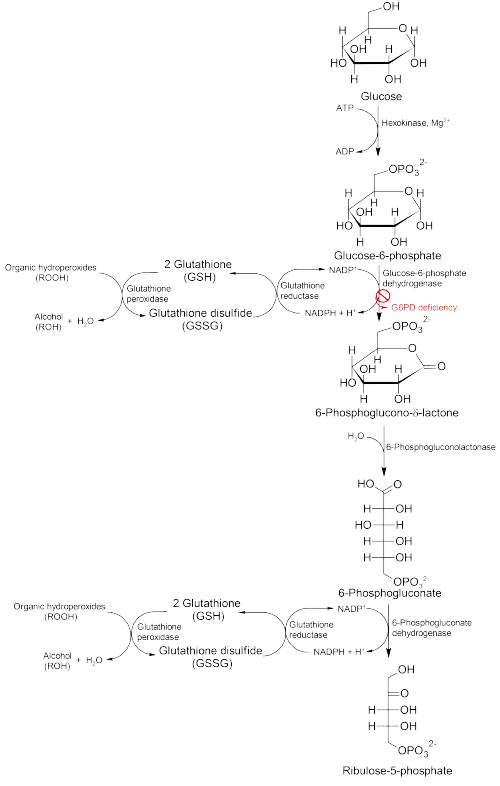 The G6PD / NADPH pathway is the only source of reduced glutathione in red blood cells (erythrocytes). The role of red cells as oxygen carriers puts them at substantial risk of damage from oxidizing free radicals except for the protective effect of G6PD/NADPH/glutathione.