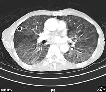 Ground-glass opacity (GGO) is a finding seen on chest x-ray (radiograph) or computed tomography (CT) imaging of the lungs. It is typically defined as an area of hazy opacification (x-ray) or increased attenuation (CT) due to air displacement by fluid, airway collapse, fibrosis, or a neoplastic process.[1] When a substance other than air fills an area of the lung it increases that area's density. On both x-ray and CT, this appears more grey or hazy as opposed to the normally dark-appearing lungs. Although it can sometimes be seen in normal lungs, common pathologic causes include infections, interstitial lung disease, and pulmonary edema.[2][3]