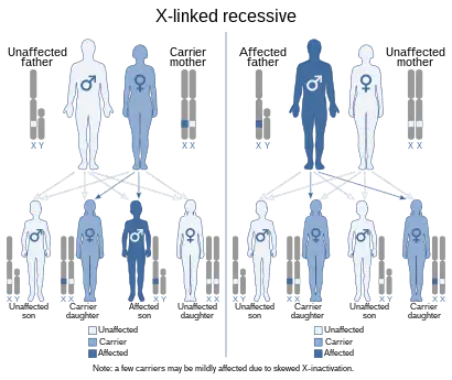 Typically, females possess two X-chromosomes, and males have one X and one Y-chromosome. Since the mutations causing the disease are X-linked recessive, a female carrying the defect on one of her X-chromosomes may not be affected by it, as the equivalent dominant allele on her other chromosome should express itself to produce the necessary clotting factors, due to X inactivation. Therefore, heterozygous females are just carriers of this genetic disposition. However, the Y-chromosome in the male has no gene for factors VIII or IX. If the genes responsible for production of factor VIII or factor IX present on a male's X-chromosome are deficient there is no equivalent on the Y-chromosome to cancel it out, so the deficient gene is not masked and the disorder will develop.