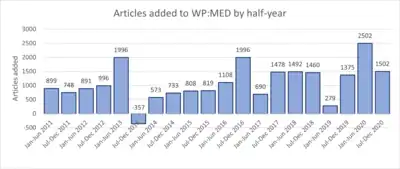 As of March 2017, the English Wikipedia had 30,000 medical articles, while there were 164,000 medical articles in other languages.[5]