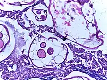 As pathogens in the body, helminths induce an immune response. Immune-mediated inflammatory changes occur in the skin, lung, liver, intestine, central nervous system, and eyes. Signs of the body's immune response may include eosinophilia, edema, and arthritis.[13] An example of the immune response is the hypersensitivity reaction that may lead to anaphylaxis. Another example is the migration of Ascaris larvae through the bronchi of the lungs causing asthma.[14]