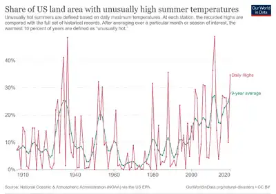 In urban areas people are at an increased susceptibility to hyperthermia. This is due to a phenomenon called the urban heat island effect.[35] Since the 20th century in the United States, the north-central region (Ohio, Indiana, Illinois, Missouri, Iowa, and Nebraska) was the region with the highest morbidity resulting from hyperthermia. Northeastern states had the next highest. Regions least affected by heat wave-related hyperthermia causing death were Southern and Pacific Coastal states.[36] Northern cities in the United States are at greater risk of hyperthermia during heat waves due to the fact that people tend to have a lower minimum mortality temperature at higher latitudes.[37] In contrast, cities residing in lower latitudes within the continental US typically have higher thresholds for ambient temperatures.[37] In India, hundreds die every year from summer heat waves,[38] including more than 2,500 in the year 2015.[39] Later that same summer, the 2015 Pakistani heat wave killed about 2,000 people.[40] An extreme 2003 European heat wave caused tens of thousands of deaths.[41]