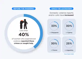 Amid the COVID-19 pandemic, many countries have reported an increase in domestic violence and intimate partner violence.[1] United Nations Secretary-General António Guterres, noting the "horrifying global surge", has called for a domestic violence "ceasefire".[2][3] UN Women stated that COVID-19 created "conditions for abuse that are ideal for abusers because it forced people into lockdown" thus causing a "shadow pandemic" that exacerbated preexisting issues with domestic violence globally.[4]