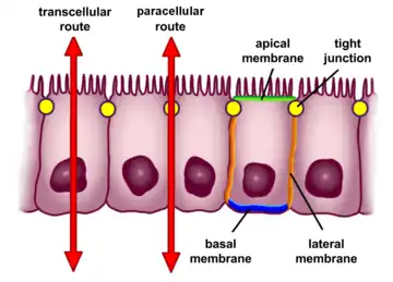 Paracellular permeability depends on transport through the spaces that exist between epithelial cells. It is regulated by cellular junctions that are localized in the laminal membranes of the cells.[17] This is the main route of passive flow of water and solutes across the intestinal epithelium. Regulation depends on the intercellular tight junctions which have the most influence on paracellular transport.[25] Studies using the electron microscope showed that the electrical resistance of epithelial layers depends on the complexity and number of filaments within the tight junction transmembrane protein complexes.[21] Also, the plasma membrane resistance and variable transmembrane conductance of the epithelial cells can also modulate paracellular pathway function.[21]