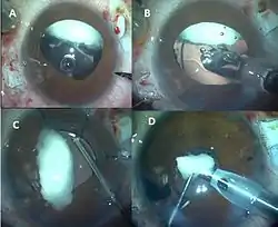- ↑ de Silva, SR; Riaz, Y; Evans, JR (2014-01-29). "Phacoemulsification with posterior chamber intraocular lens versus extracapsular cataract extraction (ECCE) with posterior chamber intraocular lens for age-related cataract" (PDF). Cochrane Database Syst Rev (1): CD008812. doi:10.1002/14651858.CD008812.pub2. PMID 24474622.