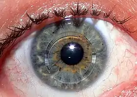 An intrastromal corneal ring segment (ICRS) (also known as intrastromal corneal ring, corneal implant or corneal insert) is a small device surgically implanted in the cornea of the eye to correct vision. Two crescent or semi-circular shaped ring segments are inserted between the layers of the corneal stroma, one on each side of the pupil,[1] This is intended to flatten the cornea and change the refraction of light passing through the cornea on its way into the eye.