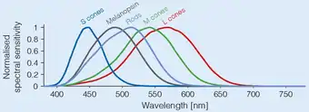 Most work suggests that the peak spectral sensitivity of the receptor is between 460 and 484 nm. Lockley et al. in 2003[19] showed that 460 nm (blue) wavelengths of light suppress melatonin twice as much as 555 nm (green) light, the peak sensitivity of the photopic visual system. In work by Zaidi, Lockley and co-authors using a rodless, coneless human, it was found that a very intense 481 nm stimulus led to some conscious light perception, meaning that some rudimentary vision was realized.[9]