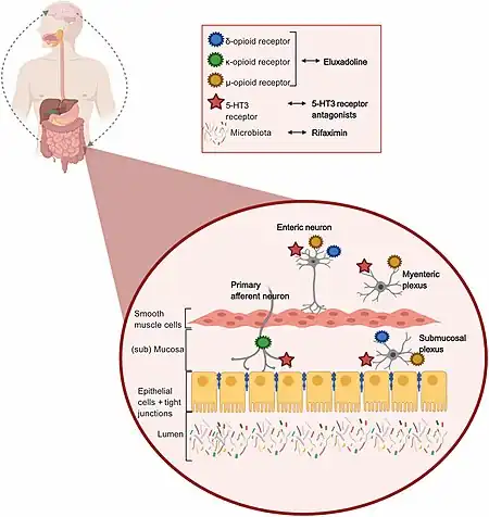 - ↑ Colomier, Esther; Algera, Joost; Melchior, Chloé (February 18, 2021). "Pharmacological Therapies and Their Clinical Targets in Irritable Bowel Syndrome With Diarrhea". Frontiers in Pharmacology. 11. doi:10.3389/fphar.2020.629026. ISSN 1663-9812.