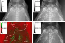Kinetic imaging is an imaging technology developed by Szabolcs Osváth and Krisztián Szigeti in the Department of Biophysics and Radiation Biology at Semmelweis University (Budapest, Hungary). The technology allows the visualization of motion; it is based on an altered data acquisition and image processing algorithm combined with imaging techniques that use penetrating radiation (e.g., X-rays). Kinetic imaging has the potential for use in a wide variety of areas including medicine, engineering, and surveillance. For example, physiological movements, such as the circulation of blood or motion of organs can be visualized using kinetic imaging. Because of the reduced noise and the motion-based image contrast, kinetic imaging can be used to reduce X-ray dose and/or amount of required contrast agent in medical imaging (e.g., X-ray angiography).[1][2] In fact, clinical trials are underway in the fields of vascular surgery and interventional radiology.[1][2][3][4] Non-medical applications include non-destructive testing of products and port security scanning for stowaway pests.[5]