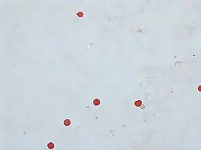 ![]() Kleihauer test, showing fetal red blood cells in rose-pink color, while adult red blood cells are only seen as "ghosts" | |