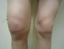 | Traumatic effusion of the right knee, with swelling lateral to the kneecap marked by an arrow | |