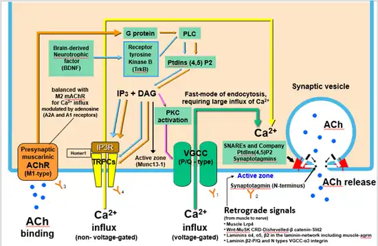 In normal neuromuscular function, a nerve impulse is carried down the axon (the long projection of a nerve cell) from the spinal cord. At the nerve ending in the neuromuscular junction, where the impulse is transferred to the muscle cell, the nerve impulse leads to the opening of voltage-gated calcium channels (VGCC), the influx of calcium ions into the nerve terminal, and the calcium-dependent triggering of synaptic vesicle fusion with plasma membrane. These synaptic vesicles contain acetylcholine, which is released into the synaptic cleft and stimulates the acetylcholine receptors on the muscle. The muscle then contracts.[4]