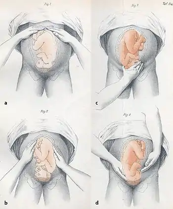 In obstetrics, Leopold maneuvers are a common and systematic way to determine the position of a fetus inside the woman's uterus. They are named after the gynecologist Christian Gerhard Leopold. They are also used to estimate term fetal weight.[1]