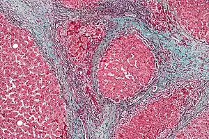 High magnification micrograph of a liver with cirrhosis. Trichrome stain. The most common cause of cirrhosis in the Western world is alcohol abuse – the cause of cirrhosis in this case.