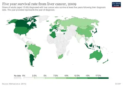 Primary liver cancer is globally the sixth-most frequent cancer (6%) and the second-leading cause of death from cancer (9%).[3][8] In 2018, it occurred in 841,000 people and resulted in 782,000 deaths.[7] In 2015, 263,000 deaths from liver cancer were due to hepatitis B, 245,000 to alcohol and 167,000 to hepatitis C.[9] Higher rates of liver cancer occur where hepatitis B and C are common, including Asia and sub-Saharan Africa.[3] Males are more often affected with HCC than females.[3] Diagnosis is most frequent among those 55 to 65 years old.[2] Five-year survival rate is 18.4 % in the United States,[2] and 40.4% in Japan.[5] The word "hepatic" is from the Greek hêpar, meaning "liver".[10]