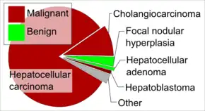 Liver tumor types by relative incidence in adults in the United States (liver cancers in dark red color).[36]