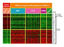 DNA-microarray analysis of Burkitt's lymphoma and diffuse large B-cell lymphoma (DLBCL) showing differences in gene expression patterns. Colors indicate levels of expression; green indicates genes that are underexpressed in lymphoma cells (as compared to normal cells), whereas red indicates genes that are overexpressed in lymphoma cells.