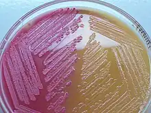 MacConkey agar is a selective and differential culture medium for bacteria. It is designed to selectively isolate Gram-negative and enteric (normally found in the intestinal tract) bacteria and differentiate them based on lactose fermentation.[1] Lactose fermenters turn red or pink on MacConkey agar, and nonfermenters do not change color. The media inhibits growth of Gram-positive organisms with crystal violet and bile salts, allowing for the selection and isolation of gram-negative bacteria. The media detects lactose fermentation by enteric bacteria with the pH indicator neutral red.[2]