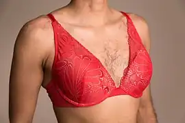 Male bra – also known as a compression bra, compression vest, or gynecomastia vest – refers to brassieres that are worn by men. Men sometimes develop breasts[1][2] and the estimates of those with the condition are presented as a range "because the definition of gynecomastia varies and the method of surveying varies."[3] Although there are options for treating gynecomastia,[4] some elect surgery to reduce their breasts or wear a male bra.[1] Male bras typically flatten rather than lift.[5]