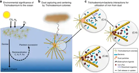 c. Proposed dust-bound Fe acquisition pathway: Bacteria residing within the colonies produce siderophores (c-I) that react with the dust particles in the colony core and generate dissolved Fe (c-II). This dissolved Fe, complexed by siderophores, is then acquired by both Trichodesmium and its resident bacteria (c-III), resulting in a mutual benefit to both partners of the consortium.[83]